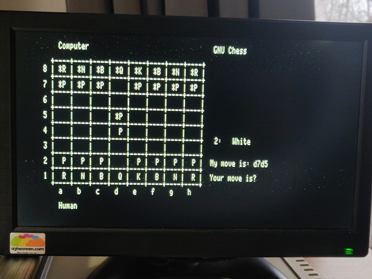 GNU Chess 4.0 plays a reasonable game if you’re patient. The 8088 at 8MHz is not fast at chess, but it thinks and it plays legal moves and it will beat you if you’re not careful.
