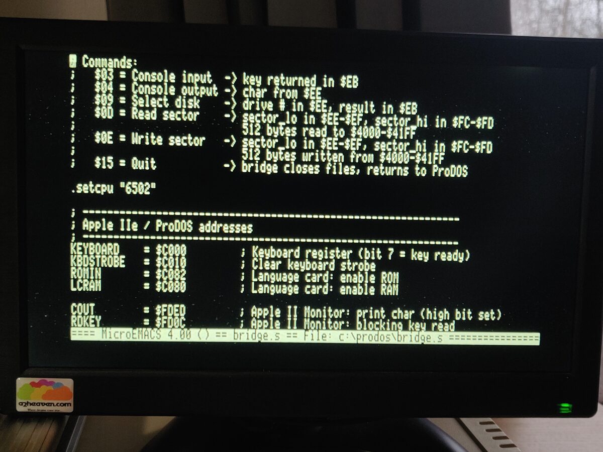 The first post covered the initial boot. Since then the bridge — the 6502 program that mediates between the 8088 and the Apple II — was relocated from $0C00 to $0800, freeing up both HGR pages ($2000-$5FFF) for programs that want to draw to the Apple II’s hi-res screen. This was harder than it sounds. The relocation exposed a cascade of buffer overlap bugs between the staging area, ProDOS I/O buffers, and the ROM copy timing. I also hit an undocumented ProDOS constraint where MLI READ limits the request count to the distance between your data buffer and the nearest internal file buffer above it in memory. That one took a while.
