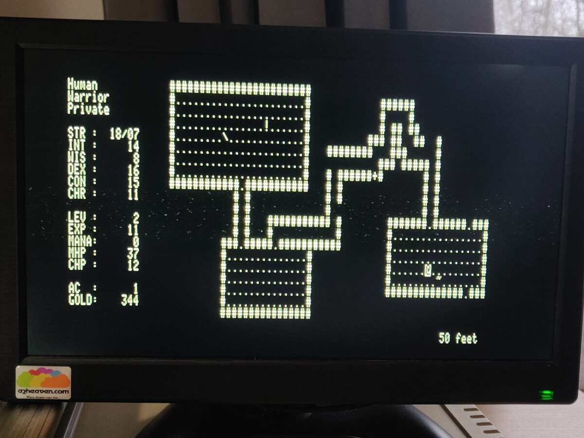 Rogue and Umoria both run. Rogue plays well — the Apple II keyboard’s lack of a numpad means you use hjkl for movement, which feels right. Umoria is slower on the 8MHz 8088 but playable. Save/restore works through the FAT12 filesystem.