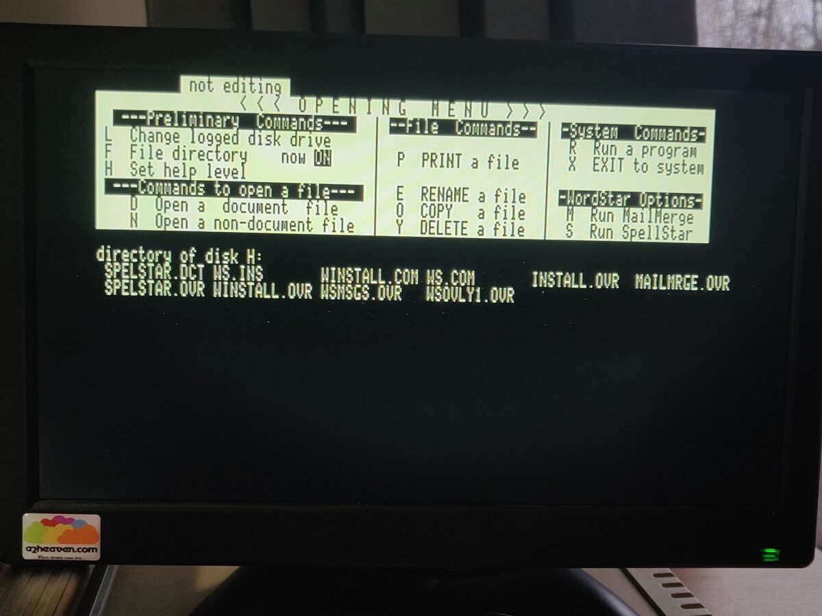WordStar 3.30 and Microsoft Multiplan 1.06 both run. WordStar needs the generic (non-PC) terminal version, which is harder to track down than you’d think, but once configured for an ANSI terminal it works well. Multiplan works with the ANSI driver out of the box.