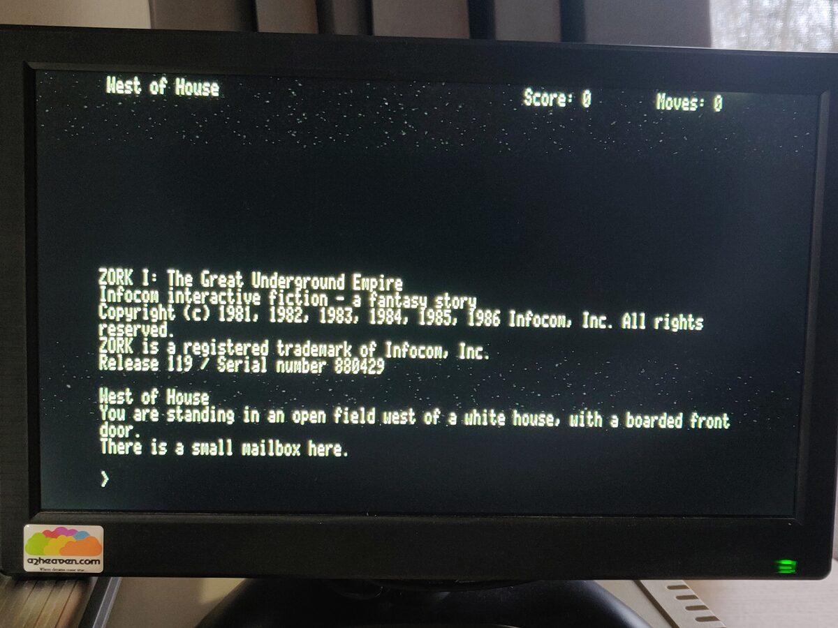 Zork I, II, and III run on Frotz, a Z-machine interpreter. Microsoft released the Zork source under MIT in 2025. Interactive fiction is a good fit for this hardware.